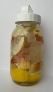 ③瓶にレモン、りんご、氷砂糖を交互に入れてホワイトリカーを注ぎ入れる。